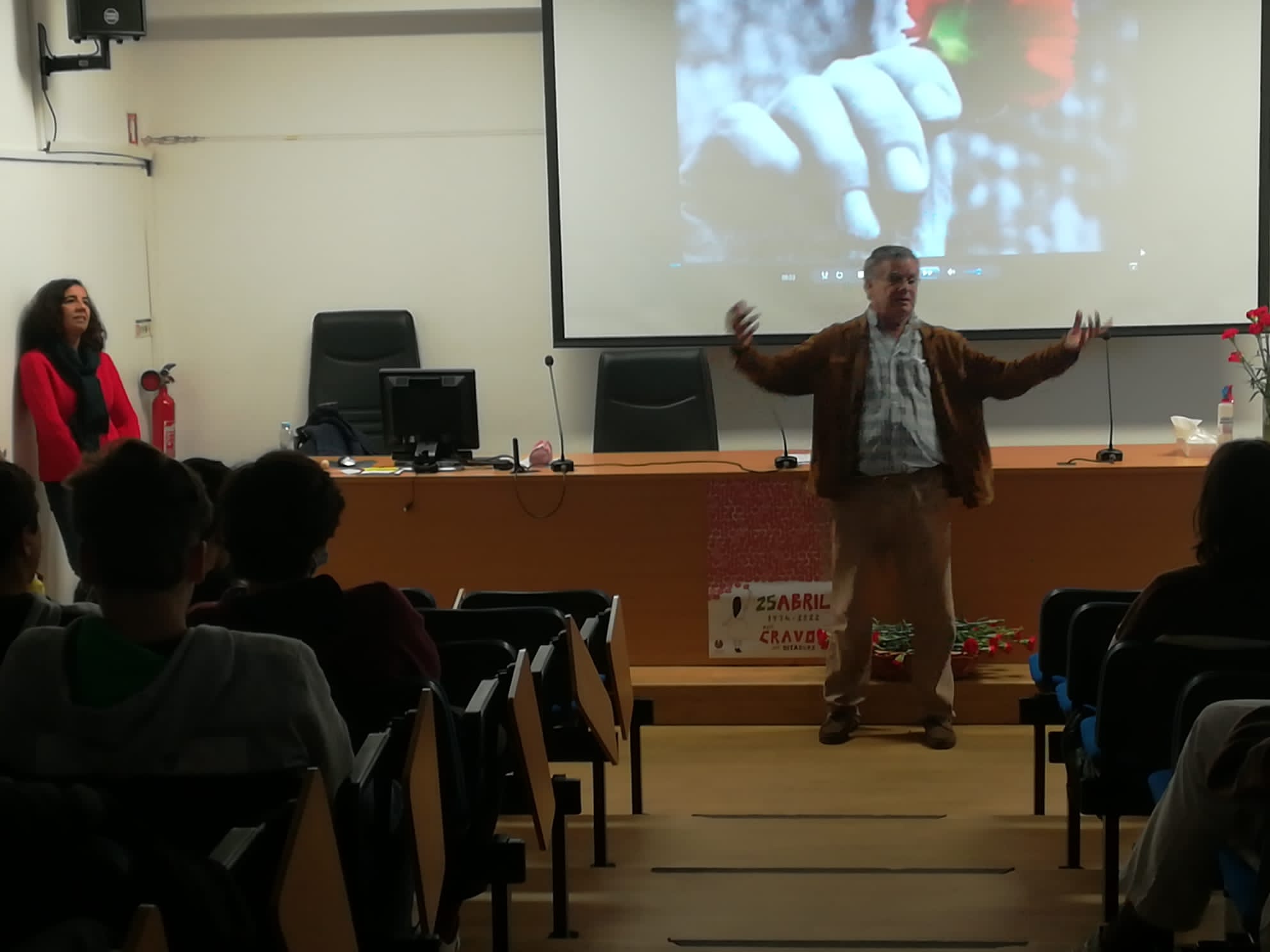 No dia 22 de abril, teve lugar, no auditório da escola, a sessão comemorativa do Dia da Liberdade. Foi dia de (re) viver abril. Foi dia de falar sobre os valores de abril. Sem medos. Foi dia de falar de liberdade, de tolerância, de respeito e de felicidade. Felicidade de dizer" Eu penso". Sem medos. Foi dia de despertar consciências, de fazer alertas, para que cada um pense por si e respeite a opinião dos outros. Sem medos. Mas também foi dia de falar sobre o cinzentismo de há 48 anos. De falar sobre pobreza e fome, prisão e tortura porque se disse "Eu penso". De tudo isto se fez o discurso emotivo de Clemente Alves, ex-preso político, dirigido aos alunos do 9ºF e 12º H1. A julgar por algumas caras de assombro, e pelas perguntas pertinentes, que se disse, teve eco. Sem medos.